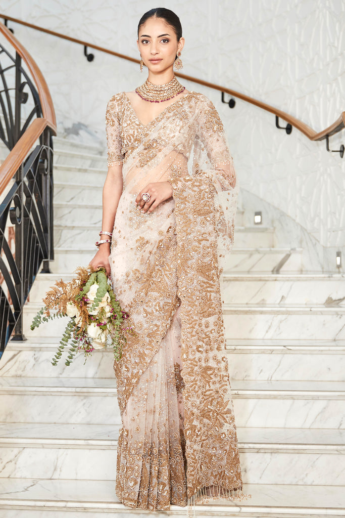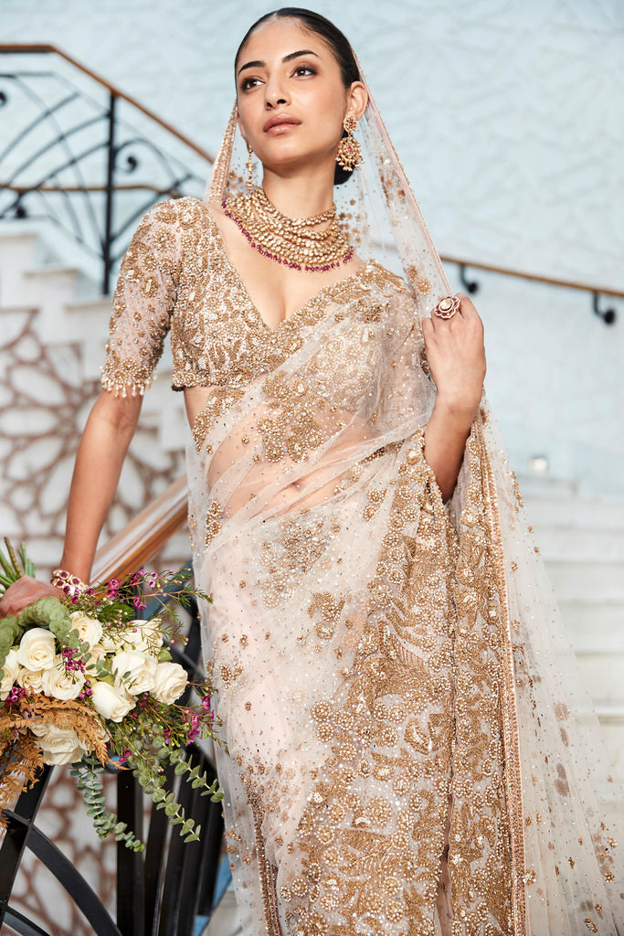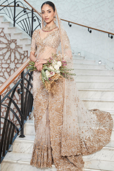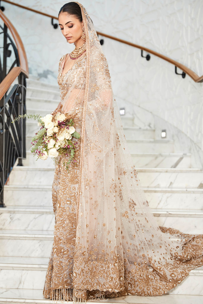 This saree carries a vintage Nizami mood, tempered by a soft, translucent glow. Antique gold kachi dori traces fine lattices and floral arcs, while vintage zardozi lends sculptural relief and crystals flicker with discreet brilliance. Draped to lengthen the line, the saree falls in fluid, measured pleats that move with quiet rhythm. A tailored blouse refines the proportions with clean structure, and a veil completes the three piece composition, airy and light, framing the embroidery without weight. Borders are finished with meticulous clarity so expanses of colour can breathe. Poised and enduring, it balances heritage craft with modern restraint, revealing texture, light, and movement in calm harmony.