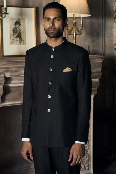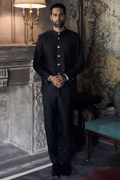 This black silk bandhgala doesn't need embellishment. It relies on precision instead. The fabric has this smooth finish with just enough sheen to give the dark tone some depth. Cut clean through the shoulders and body, the silhouette stays sharp and tailored, the kind of thing that projects quiet confidence. A band collar frames the neckline with clarity, paired with a neat buttoned front that keeps everything composed.
