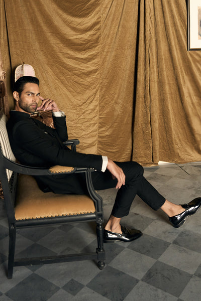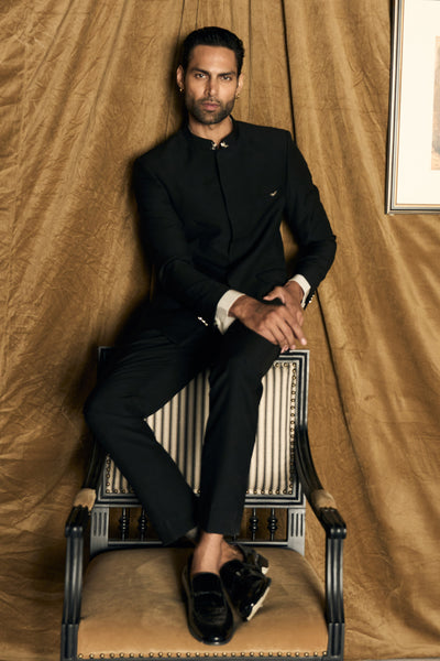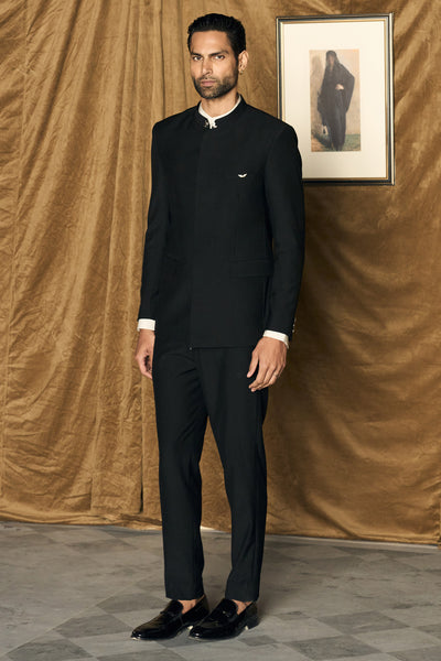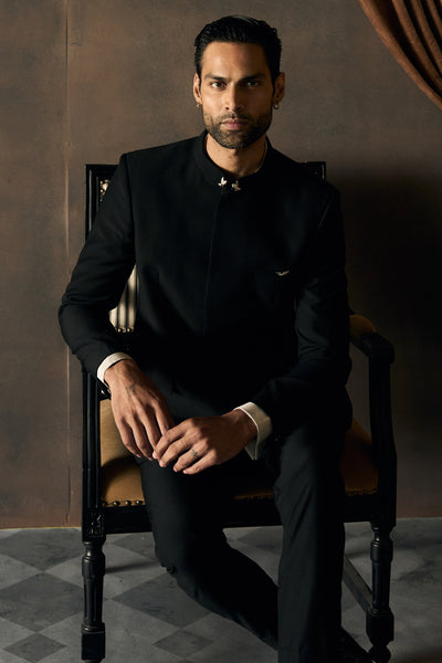 Purity of form becomes the statement here. This silk bandhgala stays uninterrupted across its entire surface, allowing the profound depth of the fabric to speak without interference. A long, straight cut shapes your body with absolute clarity, falling in a line so steady it reads almost meditative. The band collar with Matsya hardware at the edges frames the neck with precision, paired with a minimal placket that keeps everything contained and deliberate. Full sleeves trace a narrow path down the arms, holding their shape with quiet authority. Black silk carries a sheen that deepens and shifts as light moves across it, making the colour read richer, almost liquid in certain angles.