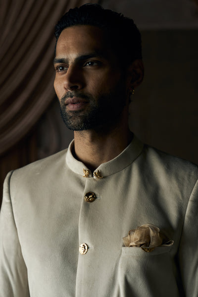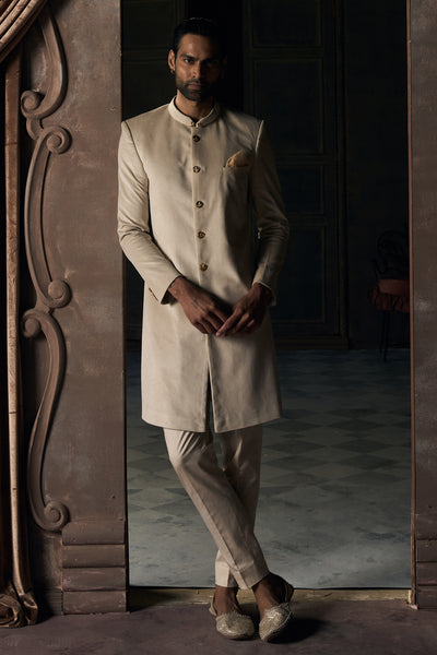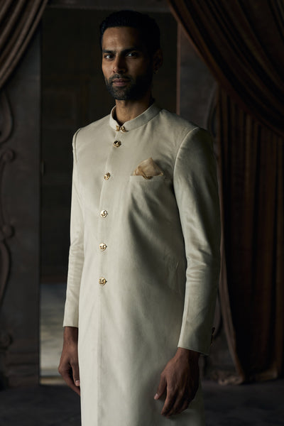 This achkan sits close through the shoulders before falling straight to mid-thigh, creating a vertical line that lengthens rather than broadens. A standing collar frames the neck area, while an asymmetric front closure angles across the chest, fastened with bold Matsya hardware buttons that catch light. The cut is deliberate, fitted enough to show structure but loose enough to move. Full sleeves taper toward the wrist, keeping everything proportional. There's weight here, substantial enough that it feels grounded wearing it, but the drape stays fluid.
