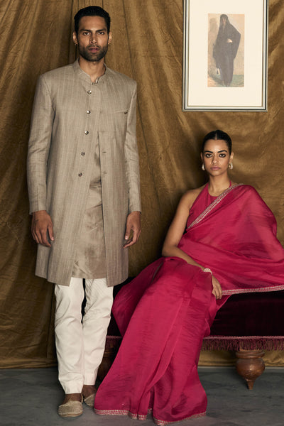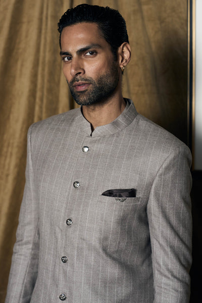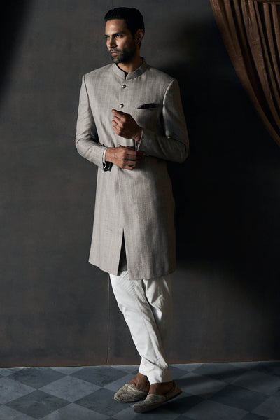 The wool-silk blend adds weight and a subtle sheen to the achkan, catching the light without being loud. Its straight, intentional cut balances structure with ease, allowing the quality of the fabric to lead the design. Because there is no embroidery and just silver buttons with Matsya wings on them, the focus remains on how the material moves and responds to the body. The silhouette works for formal settings without feeling ceremonial, for quieter moments without reading as casual. There's a clear-headed approach to the design. No embellishment to hide behind, no excess to lean on.