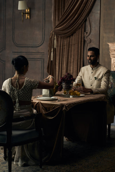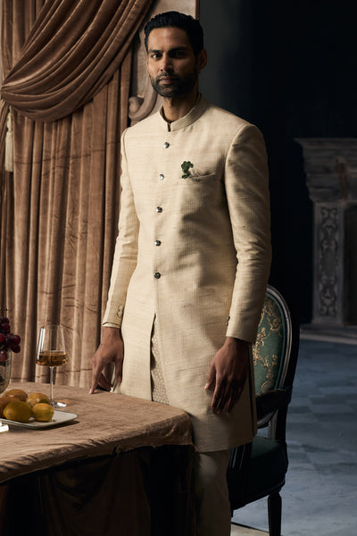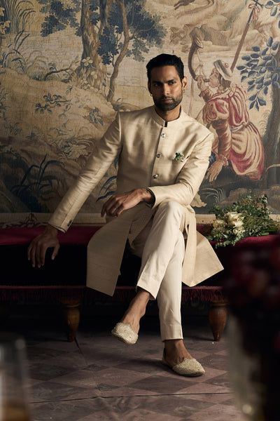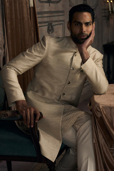 Sometimes less really is more, and this achkan proves it. Beige rambagh silk cuts long through the body in a straight, unbroken line that reads formal without feeling stiff. The shoulders carry just enough structure to square the frame, while the torso stays close but never tight, letting the fabric do its work. A band collar sits cleanly at the neck, the front closing in a seamless run that pulls the eye downward. Full-length sleeves stay slim from shoulder to wrist, keeping the proportions sharp & the Matsya hardware buttons that catch light.