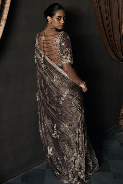 Silk tissue has that particular sheen that reads as expensive without being loud. This saree uses charcoal as its base, a shade that shifts between grey and silver depending on the light. Tarnished silver work and contemporary zardozi cover the pallu and borders in intricate floral patterns, white threadwork that creates sharp contrast against the dark fabric. Silk tissue has enough body to create defined folds rather than soft gathers. The blouse has elbow-length sleeves with embroidered details that mirror the pallu work, connecting the two pieces without repeating too much.