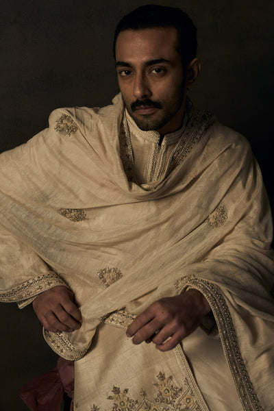 Crafted in linen silk, this stole showcases sheer luxury and grandeur in an ivory hue. Pair it with The Royal Mogra Sherwani for an unforgettable new beginning. (Sherwani is for stying only)