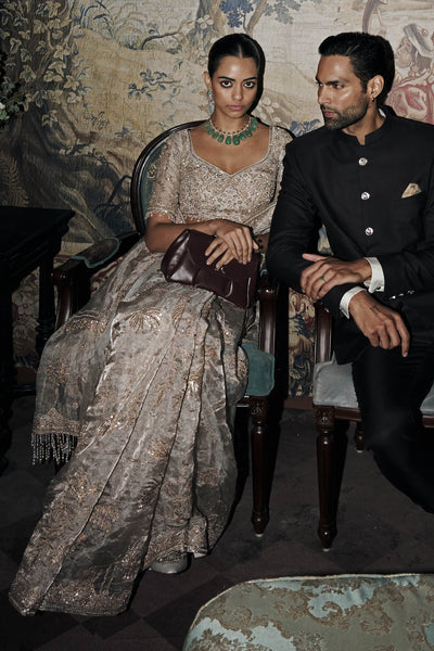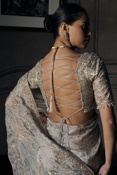 The silver silk tissue catches light like water, but softer. You get that fluid sheen without the harshness, the kind that shifts as you walk. Antique gold contemporary zardozi winds along the borders of the entire saree, each motif placed where it needs to be. The gold warms up the silver base in a way that feels intentional. The pleats fall long and clean. The blouse stays minimal because the embroidery already says enough. This is ceremonial dressing that doesn't exhaust you.