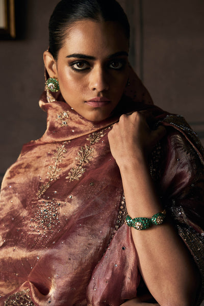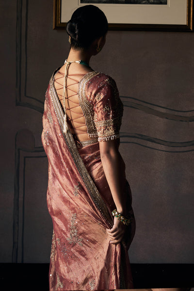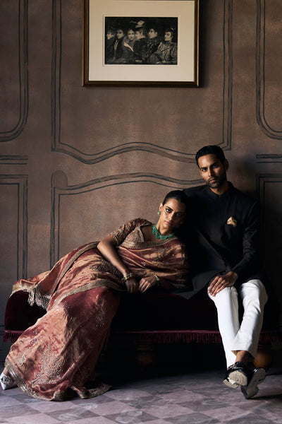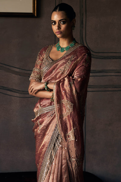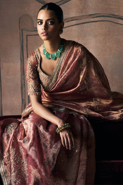 Rust silk tissue settles over the shoulder, then flows in a rhythm that feels natural rather than forced. The fabric holds a warmth that shifts as light moves across it, never flat, never too shiny. As it is draped, the saree finds its place easily, no wrestling with stiff folds or excess fabric bunching where it shouldn't. The pallu stays fluid but controlled, following one without collapsing. Anmol dori and contemporary zardozi appear sparingly, placed to add detail without taking over the whole conversation. The silk tissue feels light when it is handled, but there's enough substance that it drapes with intention rather than drifting aimlessly. Rust brings warmth without sweetness, a colour that holds up in bright rooms and low light alike.