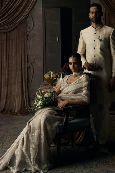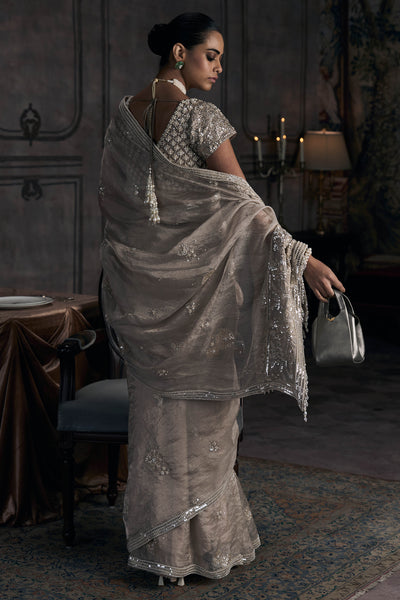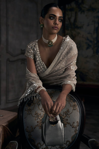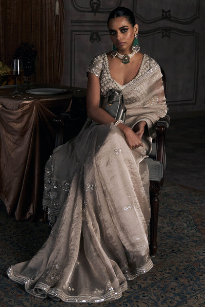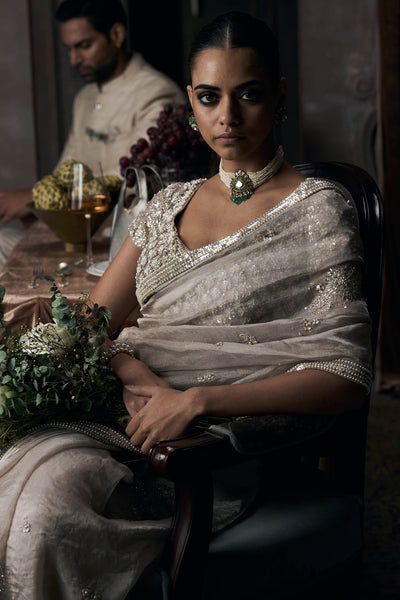 Silk tissue in beige catches light like no other fabric can. There's transparency here, layers of tissue creating depth rather than opacity, so the fabric seems to float just above the skin. Contemporary zardozi with resham aari work covers the borders and pallu in intricate patterns, dense enough to add weight where the tissue wants to drift. The work glints as you move, catching ambient light from every angle. Silver and metallic threads weave through the beige base, creating contrast without harshness. The pallu drapes across your shoulder with enough substance to stay anchored, sheer enough to feel barely there. A heavily embroidered blouse provides the counterpoint, short sleeves worked in matching threadwork, neckline cut to frame the collarbone.