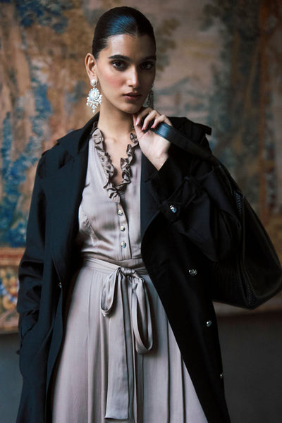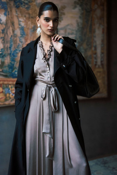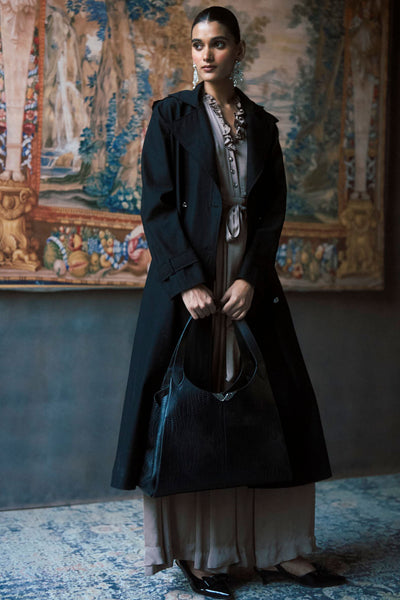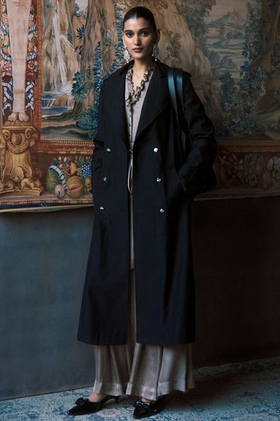 The Florentine Trench is a study in purposeful silhouette and enduring craftsmanship. Drenched in a deep, matte black, the coat features a dramatic, oversized collar and broad lapels that command a room, while the double-breasted metallic button detailing provides a sharp, rhythmic punctuation. The fabric offers a rare, textured hand-feel that balances the seasonal warmth of wool with the crisp, structural breathability of linen.