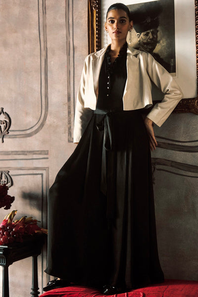 The Jackson Jacket is a study in architectural brevity, stripping away the traditional blazer's length to reveal a sharp, cropped silhouette. The piece possesses a structured hand-feel that holds its clean, boxy lines while emitting a soft, pearlescent glow. Its design is defined by a clean, open front and precise shoulder tailoring, creating a frame that emphasizes the layers beneath.