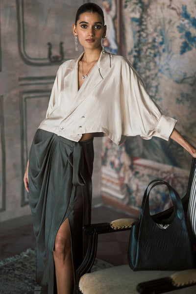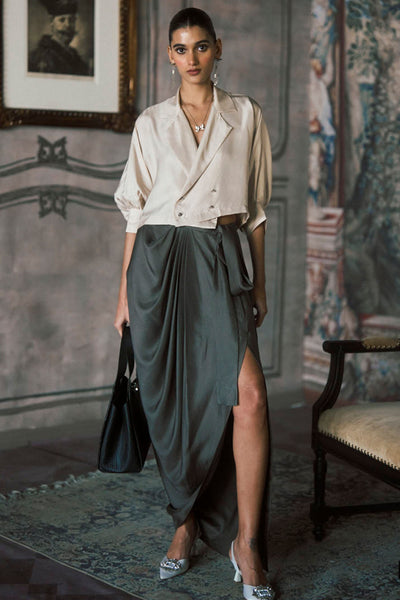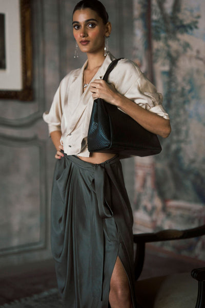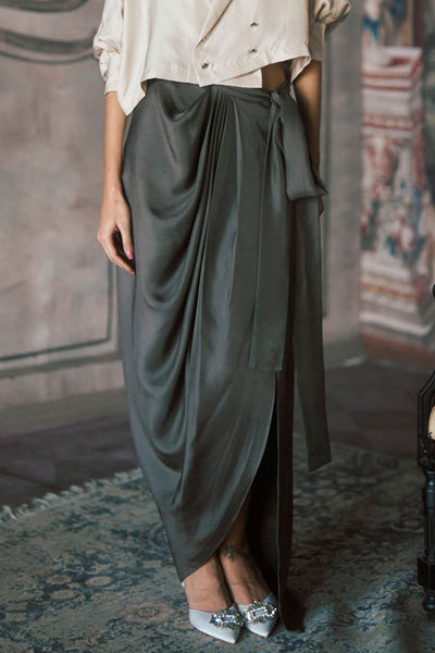 Defying the static nature of traditional tailoring, The Kyoto Drape Silk Skirt is a study in shadow and fluid form. Sculpted from twill silk, the fabric is manipulated into deep, cascading folds that gather at the waist, creating a rhythmic play of light across its charcoal grey surface. The design features a daring thigh-high slit that emerges from the layered wrap, offering a sharp, modern counterpoint to the skirt’s floor-length volume. It is a piece that breathes with an oceanic pull, making it a definitive statement of dark, monochromatic elegance.