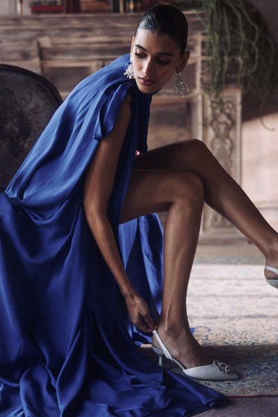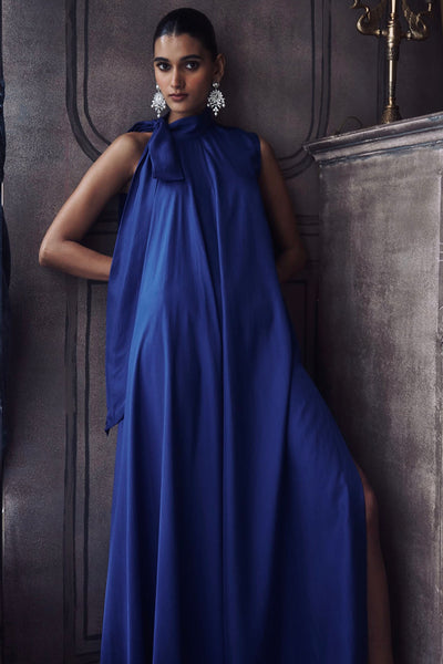 The Luxembourg Silk Dress is a striking composition of depth and movement, rendered in a saturated cobalt blue that commands a room with effortless authority. The design features a high, gathered neckline and a dramatic tie detail. A sharp side slit introduces a structural break in the sweeping hem, balancing the garment’s modest proportions with a moment of modern geometry. Striking a deliberate middle ground between architectural precision and the natural luster of silk, the dress offers a sophisticated, monochromatic presence that is both high-impact and inherently poised.