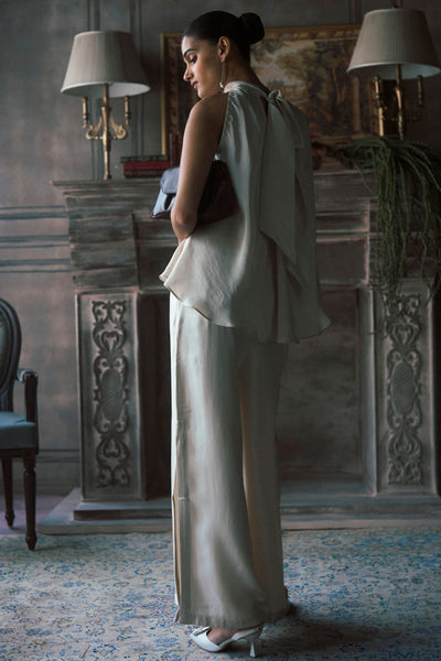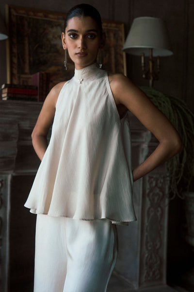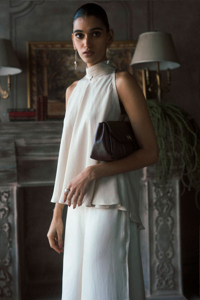 The Rambagh Top is a refined, sleeveless piece crafted from a mid-weight ecru twill silk that offers a smooth, matte finish. The design features a high, gathered halter neckline that flows into an expansive, flared silhouette, creating a sense of ease and fluid movement. A silhouette that avoids unnecessary detail, relying instead on the purity of its tone and the fluid rhythm of its shape to create a presence that is both calm and definitive.