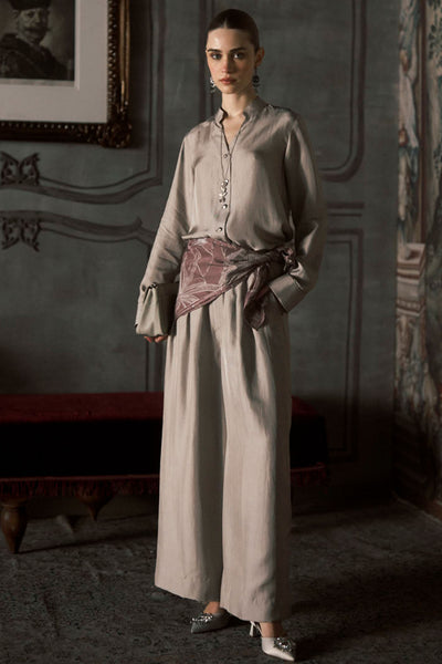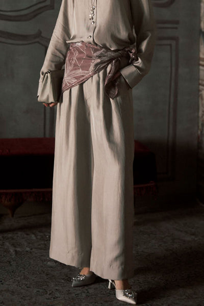 Crafted from a dense twill silk, these wide-leg pants are defined by their substantial weight and a deep tan hue that feels both earthy and polished. The design centers on a clean, high-waisted fit that flows into an expansive silhouette that lend a sense of unhindered motion to the hem. The fabric possesses a natural luster and a crispness that prevents the style from losing its shape during movement.