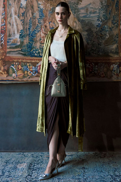 The Savannah Silk Velvet Long Jacket is crafted from heavyweight velvet in a rich shade of lime green. The design features a sharp, tailored collar and a clean silhouette that offers a modern, architectural take on the classic trench coat. Its silhouette is intentional and commanding, offering a sharp, floor-length drape that provides a structural counterpoint to the softness of the fabric.
