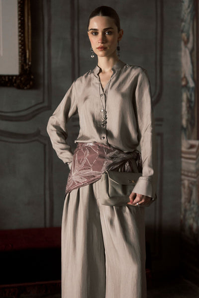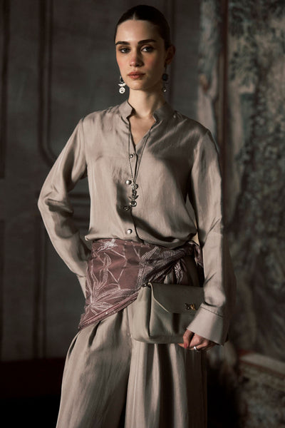 The Tokyo Silk Shirt possesses a substantial yet airy drape that captures the light in a muted, pearlescent glow. Its design features a minimalist mandarin collar and a delicate front-button closure, leading into structured cuffs that ground the shirt’s fluid silhouette. Rendered in a warm grey, this piece offers a poetic softness that bridges the gap between traditional craftsmanship and modern, metropolitan ease.