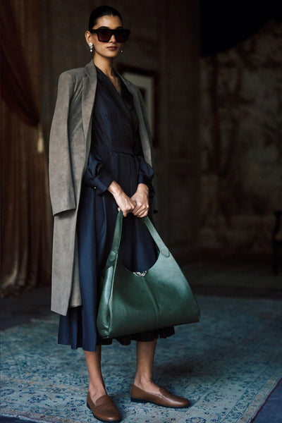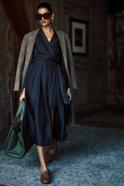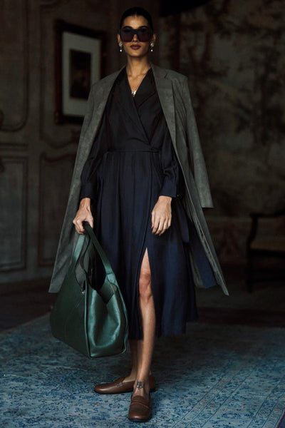 The Verona Suede Jacket is a definitive outer layer rendered in a deep brown. The silhouette is marked by traditional notched lapels and an elongated hem, providing a sense of sophisticated coverage that remains effortlessly fluid. This piece avoids excessive ornamentation, relying instead on the dense, matte texture of the suede to create a look of modern composure and quiet authority.