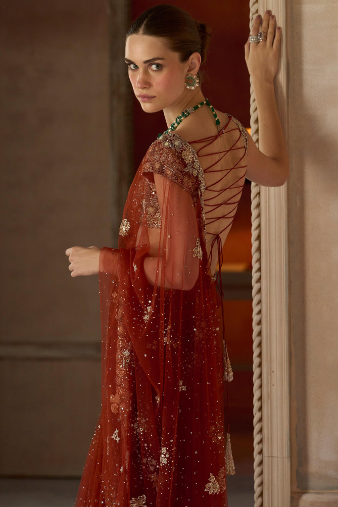 Rust settles over airy tulle in a saree that moves like light. Vintage zardozi traces fine contours across the translucent weave, while crystal accents glint with restrained clarity. Draped to lengthen the line, the pleats fall in measured rhythm and collect into a clean, sculpted pallu. The blouse is tailored close with full sleeves, refining the shoulder and keeping the proportions calm. A lightweight veil completes the three piece composition and borders are finished with precise spacing so expanses of fabric read luminous, not loud.
