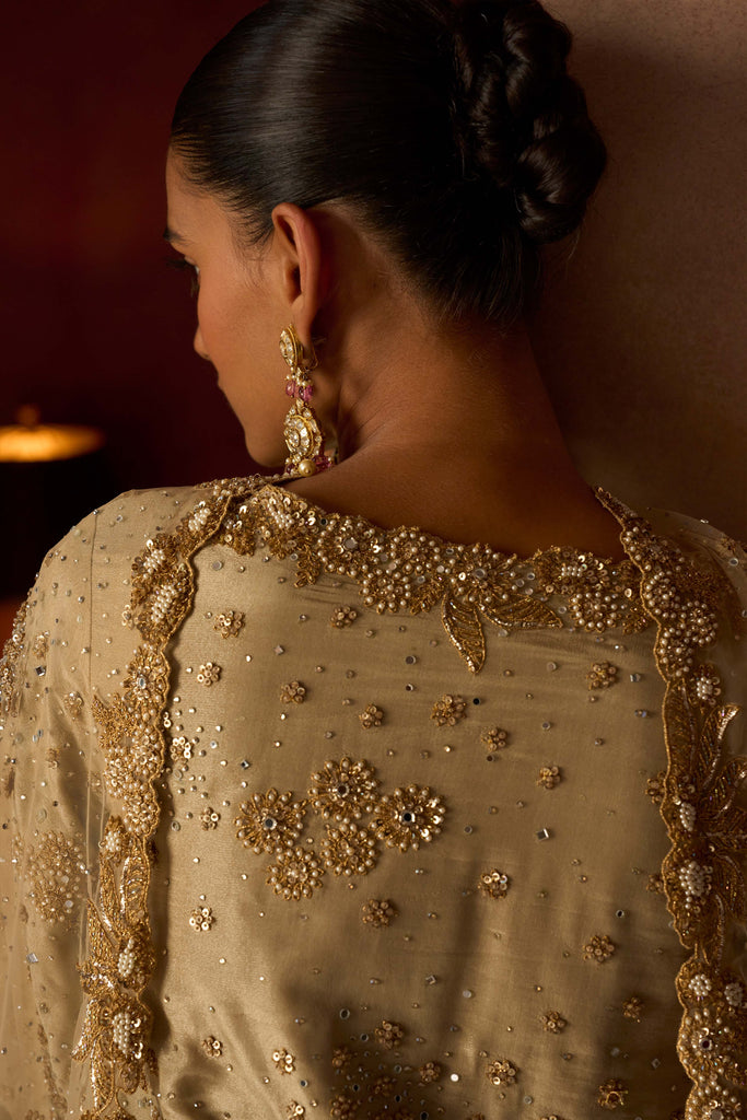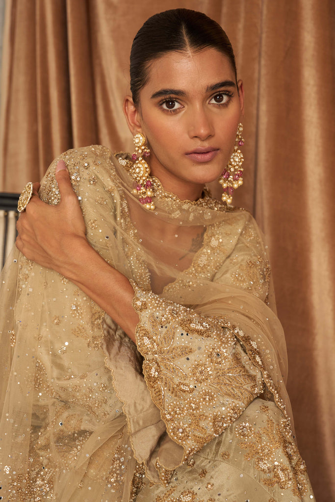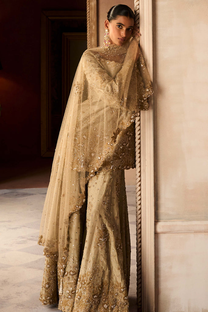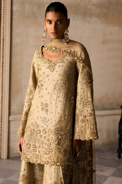 Smoky sandstone sets the tone for this three-piece sharara in silk tissue, holding a quiet gold that deepens as it moves. Antique gold kirandori trails in fine lattices, vintage zardozi adds sculptural relief, and crystal accents spark a tempered gleam across the surface. The sharara itself opens in controlled flare from a clean waist, its tiers settling into soft, symmetrical waves. The kurta is cut close through the shoulders with full sleeves and a straight hem, offering measured structure against the fluid base. A light dupatta finishes the line with sheer brightness, framing the embroidery without weight. Composed, refined, and luminous, it balances craft and clarity to create a silhouette that feels serene, elongated, and assured.