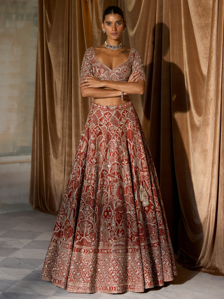 Old world rust settles over raw silk, lending a calm, stately depth to this four piece lehenga. Antique gold kirandori maps fine lattices and tendrils across the panels, while vintage zardozi lifts the surface in quiet relief and crystal accents add a tempered gleam. Panelled for controlled flare, the skirt falls in soft symmetry that lengthens the line and moves with measured rhythm. A clean, sculpted blouse with full sleeves refines the upper frame without weight. Two light drapes complete the composition with airy clarity, framing the borders and allowing expanses of colour to breathe.