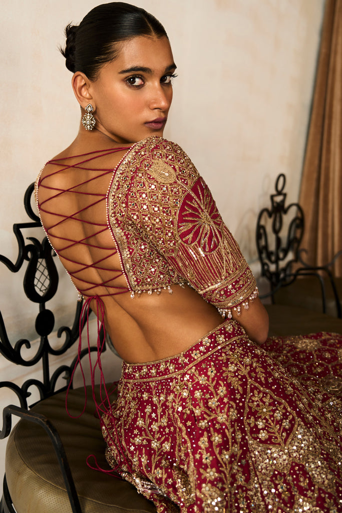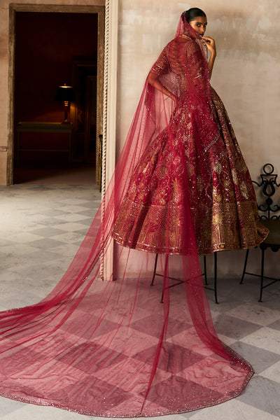 Rich scarlet silk sets the stage for a masterpiece of opulence and grace. The lehenga’s surface comes alive with antique gold kirandori and vintage zardozi, each motif blooming like a lotus in still water. Crystals glimmer across the panels, reflecting a quiet, celestial glow. The blouse, cut with structured refinement, mirrors the embroidery’s rhythm, while the voluminous skirt cascades in regal symmetry. Draped in a translucent tulle veil that trails into grandeur and paired with an embroidered dupatta.