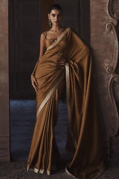 A honey amber silk saree that unfolds with quiet opulence. The colour holds warmth and depth, enriched by that natural sheen silk has as it moves across. The drape settles gracefully, pleats drawn in with care before opening into a generous fall that flows with intention. Zari work lines the border with a refined hand, catching light softly and lending gentle definition to the silhouette. The pallu follows with the same measured detailing, letting the richness of the amber stay front and centre. The blouse keeps things understated, offering balance to all that fluidity.