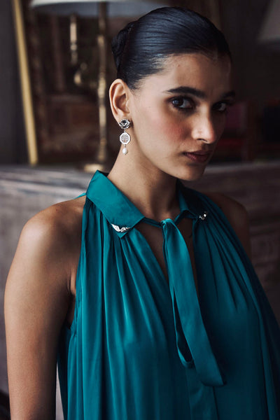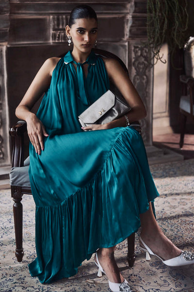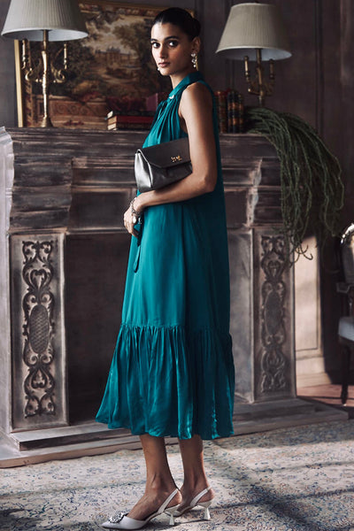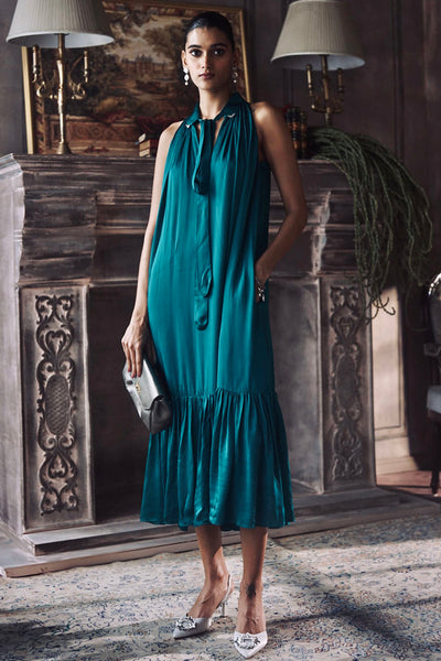 The Gatsby Dress is a sophisticated exploration of texture and tone, defined by its rich emerald green hue and high-luster silk. The design features a structured high-neckline with a refined tie detail, transitioning into a fluid, sleeveless silhouette that terminates in a crisp, ruffled hem. Its construction prioritizes a clean drape and a luminous finish, offering a polished look that balances vintage inspiration with a modern, streamlined sensibility.