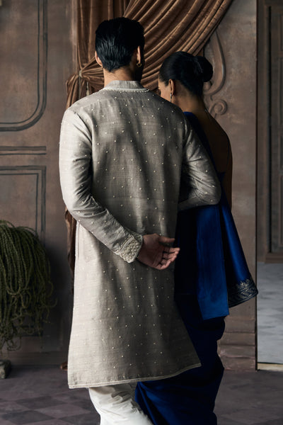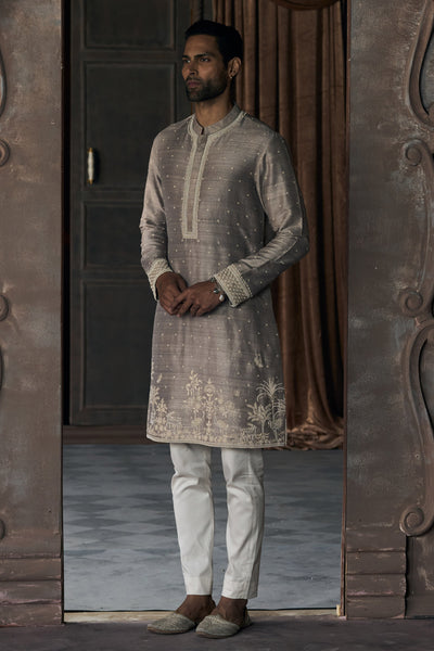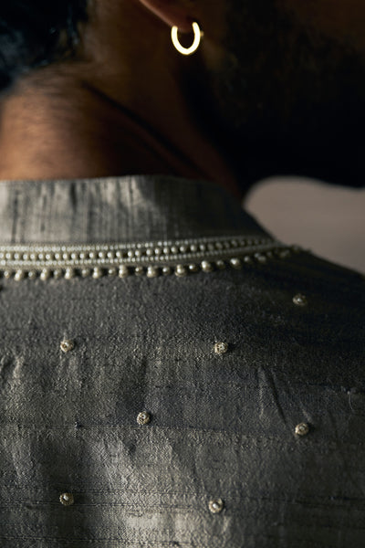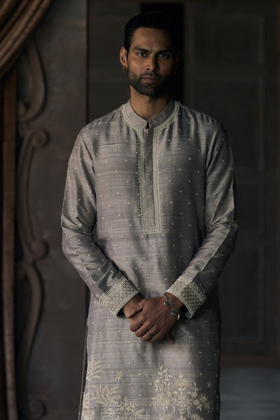 Muted grey rambagh silk, cut long and straight to fall well below the knee with a kind of calm assurance. The silhouette doesn't try too hard. Contemporary zardozi with resham aari work spreads across the body in measured intervals, then intensifies as it nears the hem, where the work clusters with clear intention. Each motif earns its place, building depth without muddying the line. A band collar and short placket keep the neckline spare, so the embroidery can do its work undistracted. Full sleeves hold their shape through the shoulders but move easily when you do. The grey stays quiet, never competing with the craft laid into it.