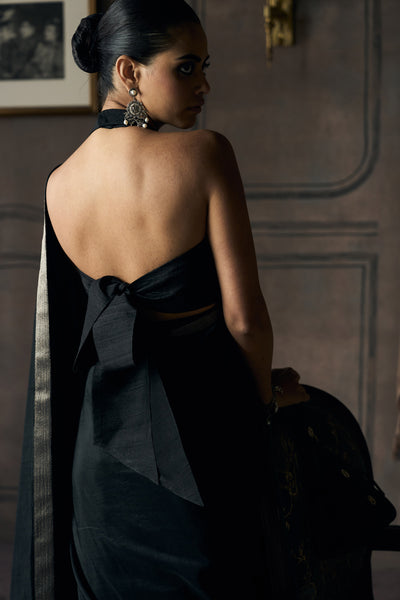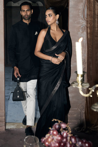 Silk has a way of commanding attention without asking for it. This saree sweeps from shoulder to floor in one continuous, fluid line that refuses to break or bunch. The fabric skims the body, close enough at the waist to show shape, loose enough through the length to move freely. Pleats fall neatly from the waist, stacked with precision but never stiff, creating that classic fan effect. A subtle zari border traces the edges, metallic thread glinting as you walk, framing the saree without stealing focus from the silk itself. The pallu cascades over the shoulder with controlled volume, draped to stay put without pinning or fussing. The hemline runs straight and clean, hitting the floor at exactly the right length. Silk this dark absorbs light differently, creating depth rather than shine. The overall effect is modern in its restraint but rooted in traditional draping principles.