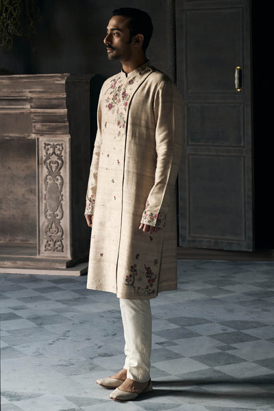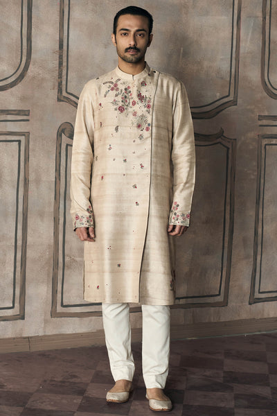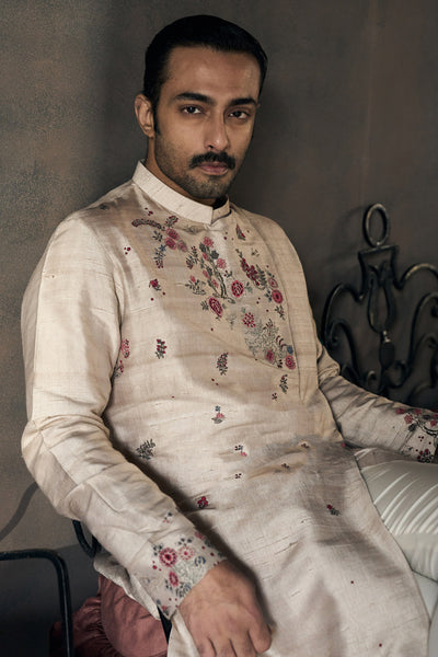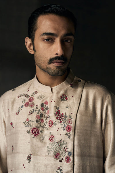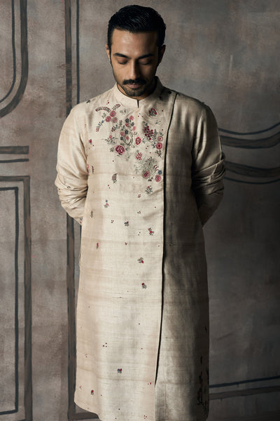 This raw silk kurta in beige carries weight without stiffness, the kind that settles across your shoulders and stays put. A straight silhouette runs from chest to hem, falling just past the knee with enough room to breathe but nothing excess. Full sleeves taper slightly toward the wrist, keeping the line clean. The collar stands low and curved, framing the neck without crowding it. Multicolour resham aari threadwork clusters asymmetrically across the chest and right shoulder.