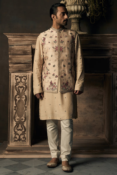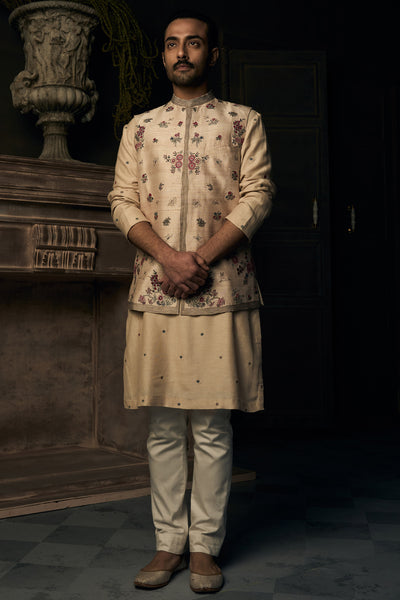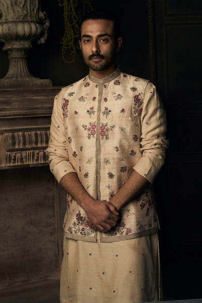 This beige ensemble pairs a rambagh silk bandi over a linen silk kurta. The bandi opens at the front, revealing multicolour resham aari embroidery scattered across the chest and running down one side in an asymmetric placement. Pinks, greens, and golds thread through the beige base, concentrated near the neckline then dispersing as they move lower. Full sleeves of the kurta stay slim from shoulder to wrist, keeping everything proportional. Rambagh silk on the jacket gives you a dry, substantial hand feel, while the linen silk kurta underneath breathes and moves more freely. The two fabrics create contrast in weight and texture without clashing. Embroidery appears again at the cuffs, wrapping the wrists in dense detail.