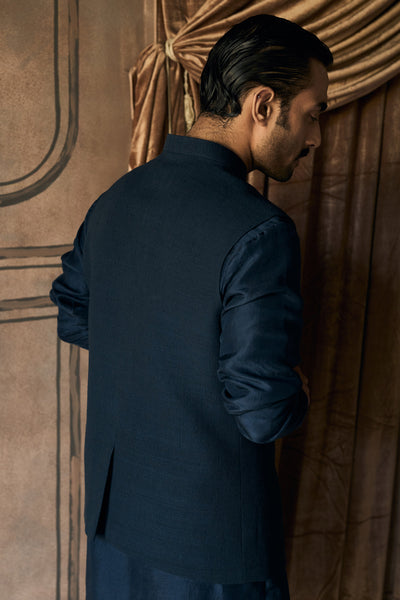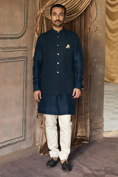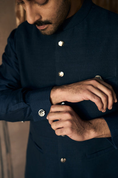 A rambagh silk jacket sits close through your shoulders, tailored to end precisely at the hip with a line that holds firm & the Matsya hardware buttons look minimal but catch light. Underneath, a silk kurta falls longer, creating that layered tension between structure and flow that makes an entrance work. The collar stands sharp at the neck, paired with a front closure where subtle buttons mark their presence without shouting. Rambagh silk does what it does best here: holds form, carries texture, refuses to collapse. The silk kurta beneath softens everything, moving against the skin where the jacket stays resolute. Sleeves stay clean, no fuss, directing every bit of attention to how the pieces work together.