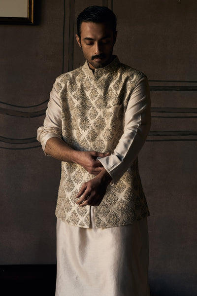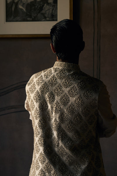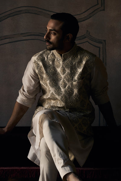 Surface work defines this piece before anything else. Dori hand embroidery spreads across the rambagh silk jacket in a repeating lattice, each motif held with such precision that one can trace the artisan's hand in every line. The jacket cuts sharp through the shoulders, then drops straight, building a silhouette that carries weight without feeling heavy. A clean front opening and restrained neckline give the embroidery room to breathe and command. Beneath it, a Chanderi kurta extends the line with a lighter, more fluid hand, creating that essential contrast between structure above and movement below.
