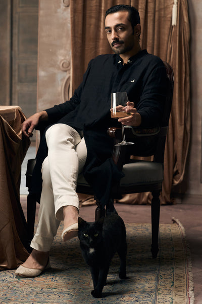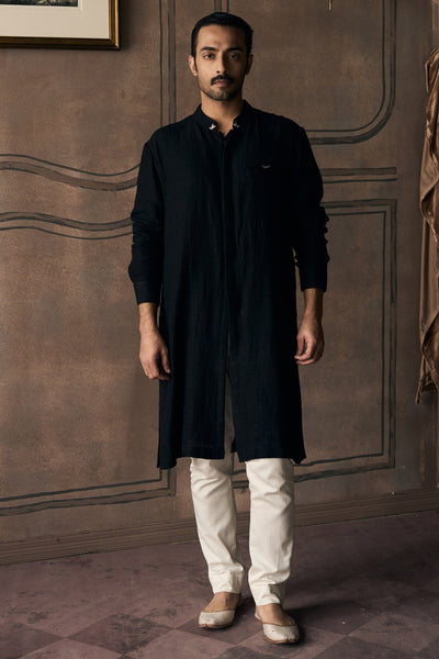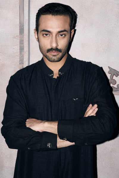 Monochrome doesn't mean monotonous, not when the cut does this much work. The kurta falls to the knee in a straight, uncluttered line that creates a lean vertical column from shoulder to hem. Full sleeves cut slim and taper as they reach your wrist, keeping everything in proportion. A band collar with signature Matsya hardware sits close to your neck, pulling focus upward and giving the neckline a formal edge. The front closes with a concealed placket, so nothing disrupts the clean surface. Panels are worked into the construction, structured just enough to hold the silhouette without adding bulk or stiffness.