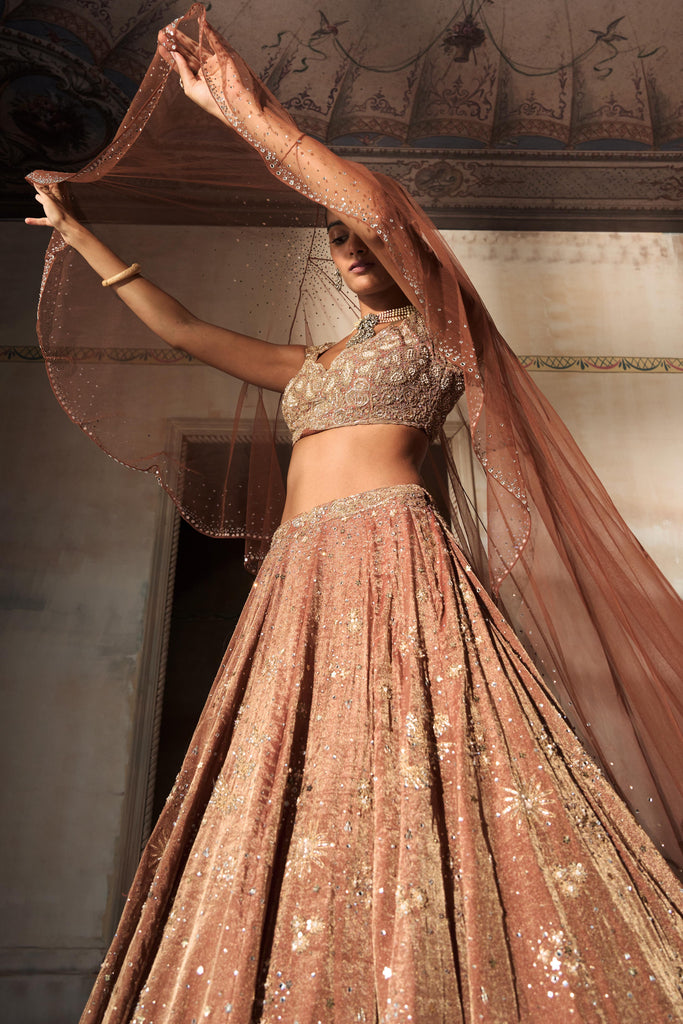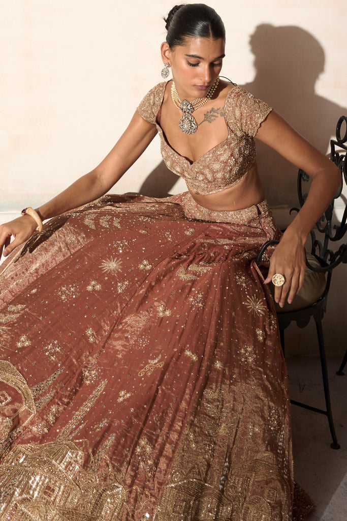 Sun warmed tangerine rust suffuses silk tissue, casting a mellow radiance through this three piece lehenga. Antique gold kirandori maps fine arabesques across the panels, while vintage zardozi builds subtle relief and crystal accents lend measured sparkle. The skirt is panelled for controlled flare, falling in soft symmetry that lengthens the line and moves with quiet rhythm. A clean, sculpted blouse with full sleeves refines the upper frame without weight, its seams placing the focus on proportion and poise. A translucent dupatta completes the composition, light enough to keep the embroidery breathing and the colour luminous. Finished with precise borders and calm spacing, the ensemble balances craft and restraint, letting texture, movement, and light resolve into a presence that feels warm and modern.